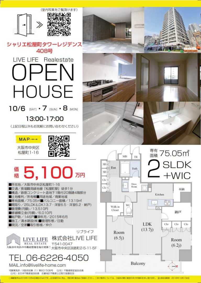 10月6・7・8日 オープンハウス『シャリエ松屋町タワーレジデンス 408号』VR内覧も可 【株式会社LIVE LIFE(リブライフ)】 2018年10月4日 OPEN HOUSE livelife オープンハウス情報! 次の三連休 10月6日(土)・7日(日)・8(月) 13時より17時までオープンハウスを開催致します。 現地では、この物件に... 続きを読む