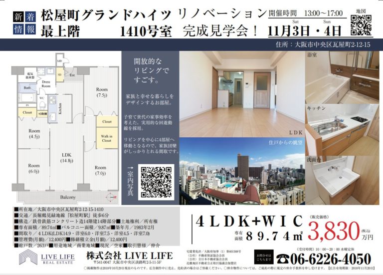 11月3日sat・4日sun 13時よりオープンハウス 松屋町グランドハイツ最上階!【株式会社LIVE LIFE(リブライフ)】 2018年11月1日 OPEN HOUSE livelife オープンハウス情報! 先日、ブログに掲載いたしました物件 →【松屋町グランドハイツ1410号】 11月3日(土)・4日(日) 13時より17時までオープンハウス... 続きを読む